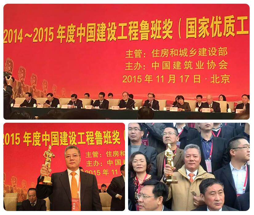 2015年11月17日,“2014年-2015年度中国建设工程鲁班奖(国家优质工程)”表彰大会在北京钓鱼台国宾馆隆重召开,现场气氛十分热烈,住房城乡建设部在会上通报表彰了包括我司在内的200家获奖企业,集团董事长郑继坤先生从住房城乡建设部副部长易军手中接过中国建筑业工程质量最高荣誉的鲁班奖金杯。